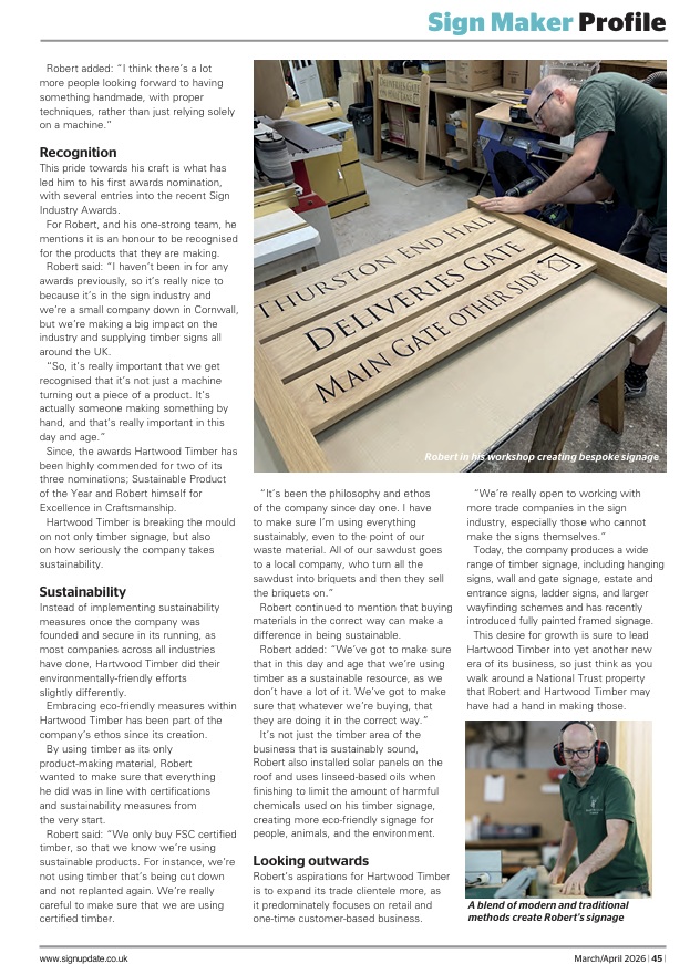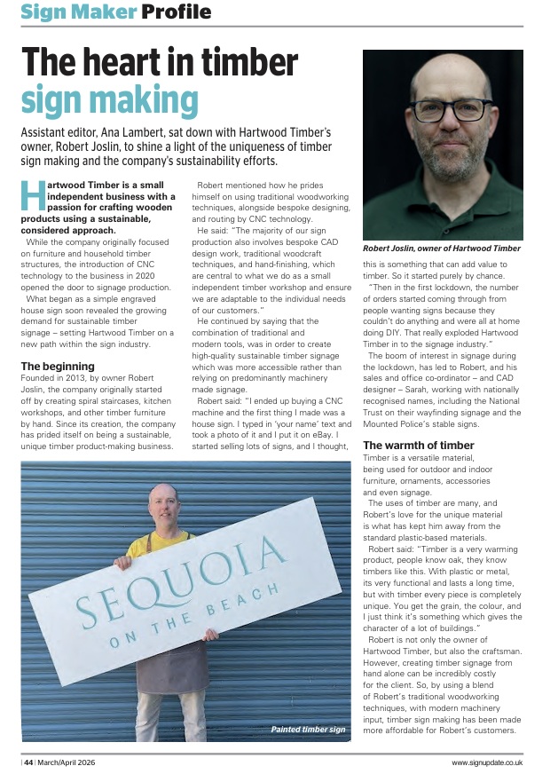 We are thrilled to share that owner and craftsman of Hartwood Timber, Robert Joslin, was recently interviewed by Sign Update Magazine for their “Sign Maker Profile” feature in the March/April 2026 edition!
