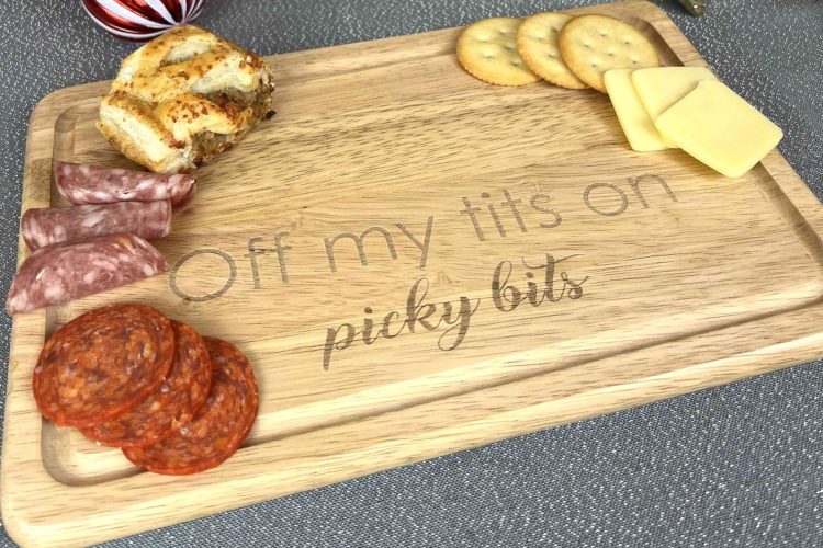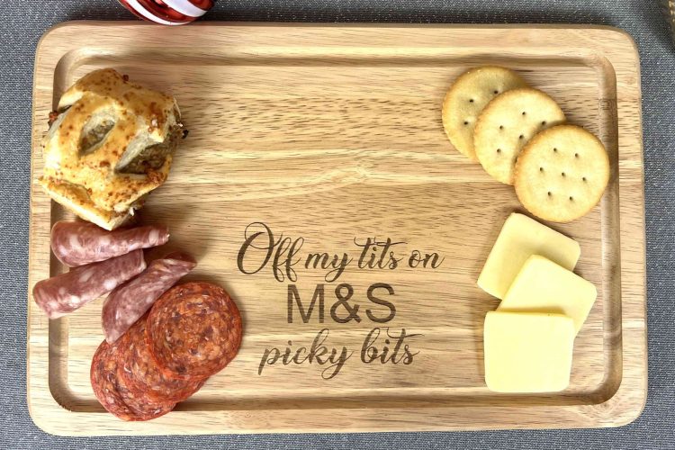 Each board is crafted from smooth, durable rubberwood and engraved with the viral slogan that can be customised. It’s the perfect mix of cheeky British wit and everyday practicality — a must-have for anyone who loves picky bits, prosecco, and a good laugh in the kitchen.